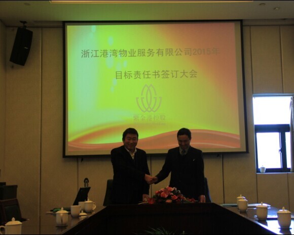 2015年1月10日上午,浙江港湾物业服务有限公司2014年管理人员年终述职大会在紫金港大酒店7楼紫金厅召开。由港湾物业总经理助理刘佳主持,总经理斯鸣俊和总裁助理石玉红先后发言致辞,紧接着各项目管理人员述职演讲,陈述自己2014年的工作心得与感悟,总结自己工作中的经验和不足。 下午,举行了隆重的目标责任书签订仪式,各项目负责人签2015年度目标管理考核责任书,明确了2015年的管理要求和目标责任。