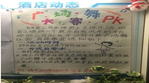 为丰富公司全体员工文体生活,给员工提供一个展示自我风采的平台,控股公司开展广场舞比赛。此时酒店公司的员工已开始紧张排练,全民广场舞大健身如火如荼的进行中。