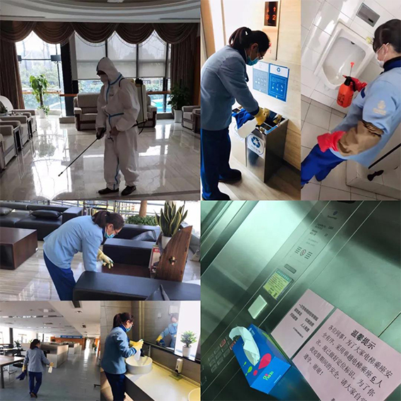 保洁部每日对大楼、办公室区域、公共区域统一定时消毒,不给病毒有机可乘。面对疫情,我的安全措施是专业的。