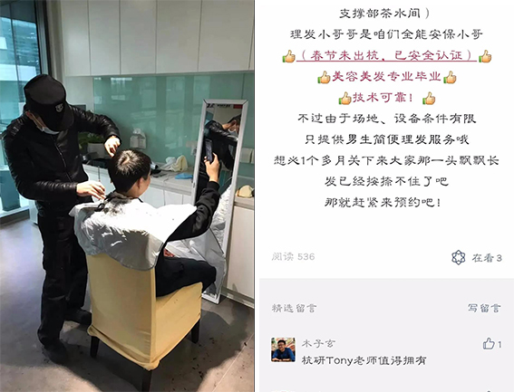 为解决此事带来的不便,项目部积极挖掘项目职工潜力,寻找到了一位自己的“托尼老师”——美容美发专业毕业的安保小哥,向甲方申请为项目及甲方职工提供便捷理发服务,并得到了甲方的大力支持。