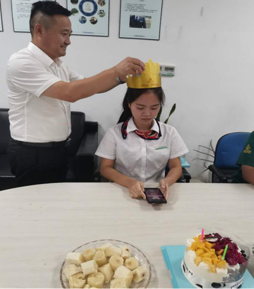 生日会正式开始了,李总说:”能够一起工作是一种缘分,为大家办集体生日会,这虽然只是一个小小的举动,但倾注了公司对员工的一片关爱,更是给大家带来家的温暖,希望每一位员工在这里工作的开心,快乐!“。接下来,他亲自为寿星们带上生日皇冠,并和他们进行轻松愉快的交谈。
